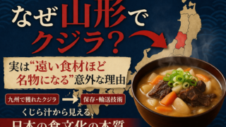 山形名物「くじら汁」はなぜ生まれたのか?実は名物料理は地元で獲れるものとは限りません。本記事では、江戸時代の流通や人の心理から「遠い食材ほど名物になる理由」をわかりやすく解説します。