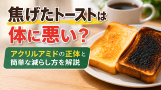 焦げたパンやポテトに含まれるアクリルアミドとは?コーヒーや緑茶が摂取源の半分を占める理由や、家庭で簡単にできる90%削減方法を解説。今日からできる安全な食べ方をわかりやすく紹介します。